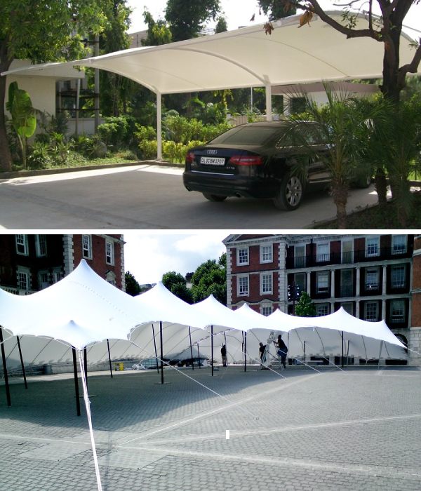 Tensile Car Parking can be made into various shapes through tension in fabric and balancing stress via support structure. The creatively made fabric contours and edges make it stand out from the conventional building methods.